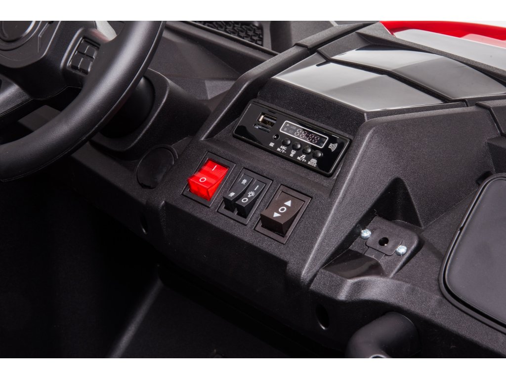 Wyposażenie elektrycznego autka obejmuje przednie i tylne światła LED oraz panel muzyczny z wejściami MP3, AUX i USB. Podczas uruchamiania pojazdu usłyszysz dźwięki silnika. O bezpieczną jazdę dbają pasy bezpieczeństwa. Pilot zdalnego sterowania pracuje na częstotliwości 2,4 GHz i ma trzy prędkości oraz przycisk bezpieczeństwa Stop, który natychmiast zatrzymuje pojazd i wyłącza wszystkie jego funkcje.