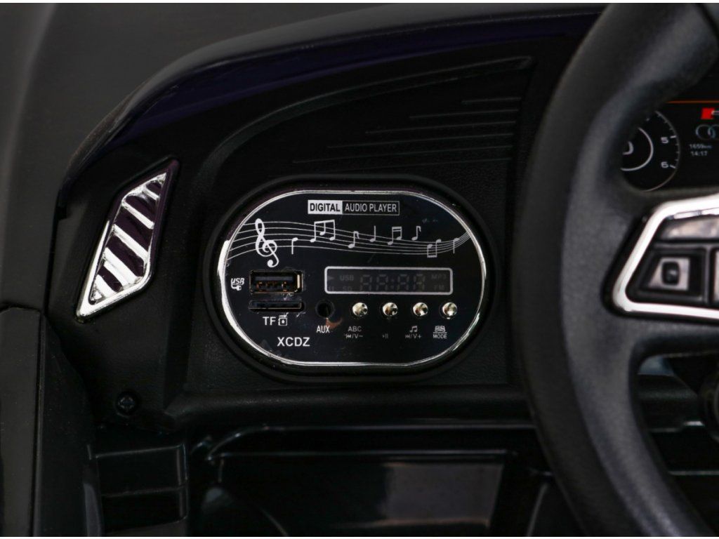 W bogatym wyposażeniu znajduje się przednie i tylne światła LED oraz panel muzyczny z wejściami USB, SD, MP3 i AUX. Autko posiada wgrane melodie oraz klakson na kierownicy.