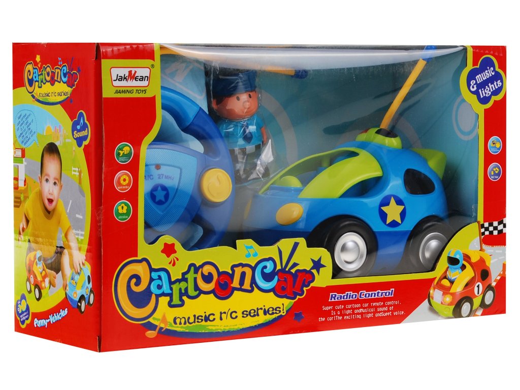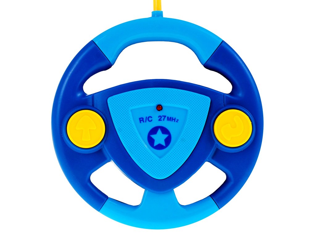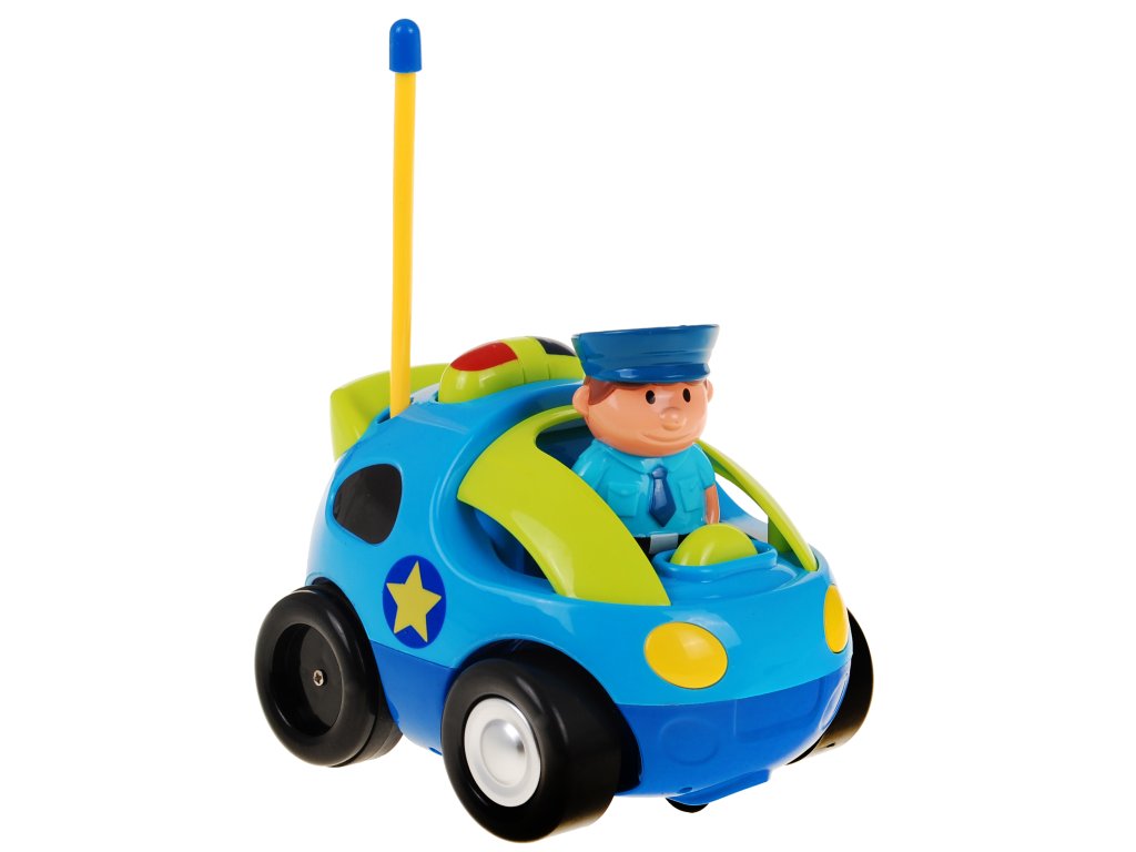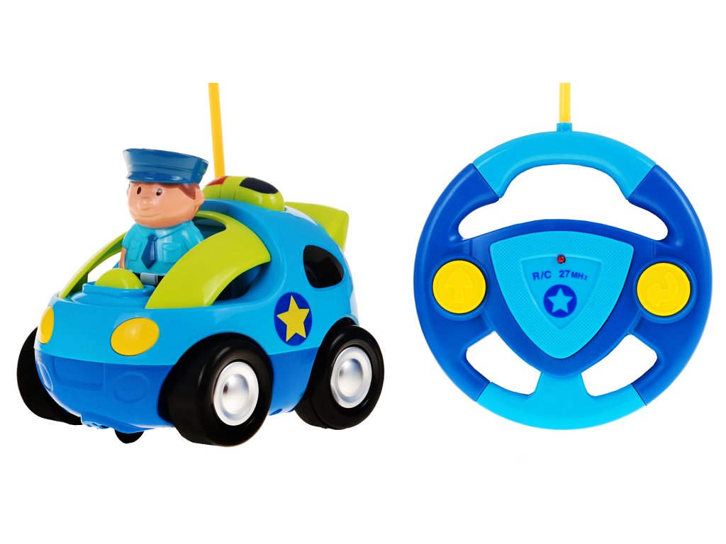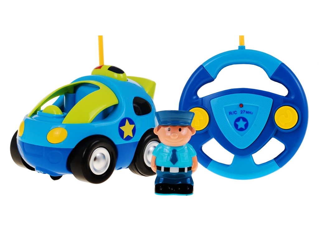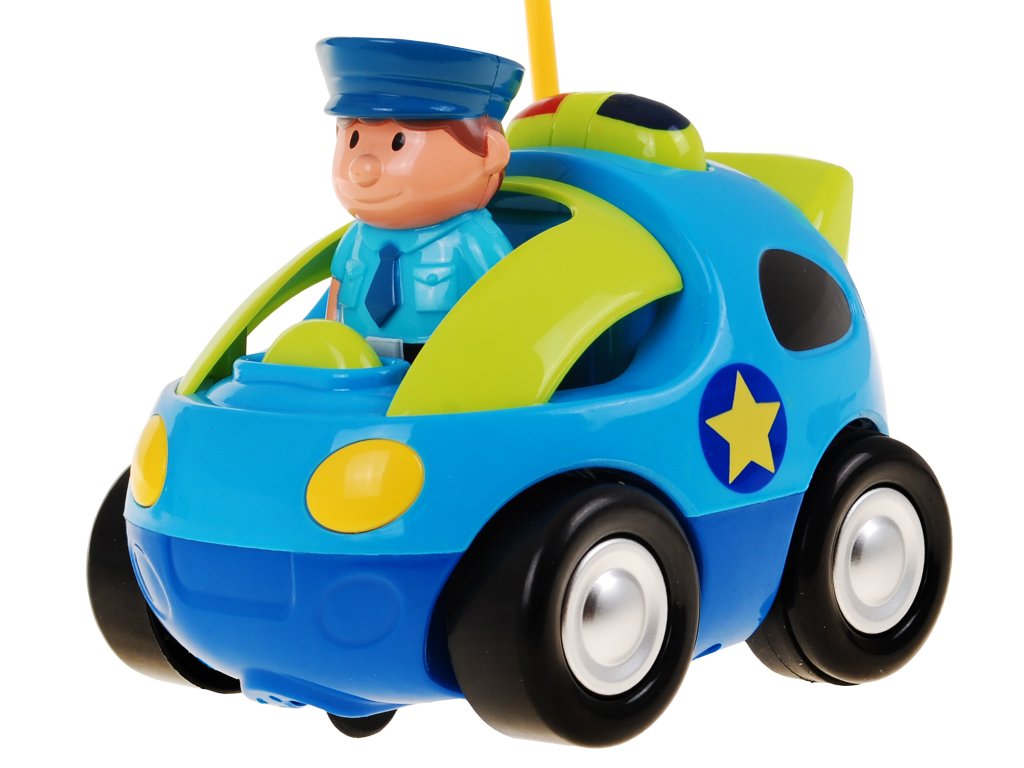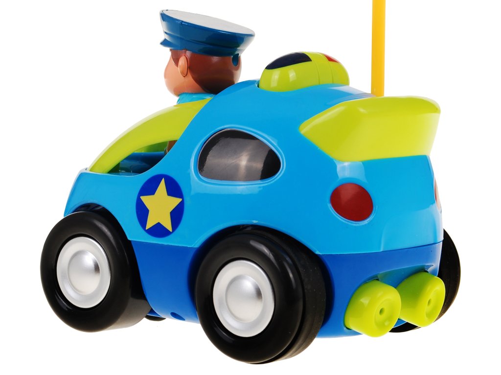 Proste zdalne sterowanie w kształcie kierownicy dla małych dzieci, które szybko i łatwo nauczą się prowadzić autko. Trzy przyciski na masce auta uruchamiają różne dźwięki, a wszystko towarzyszą migające przednie światła. Policyjne autko porusza się do przodu, do tyłu i skręca, a podczas jazdy świecą przednie światła. Jazda jest dynamiczna, a dzięki gumowym kółkom autko jeździ cicho i świetnie trzyma się podłogi.