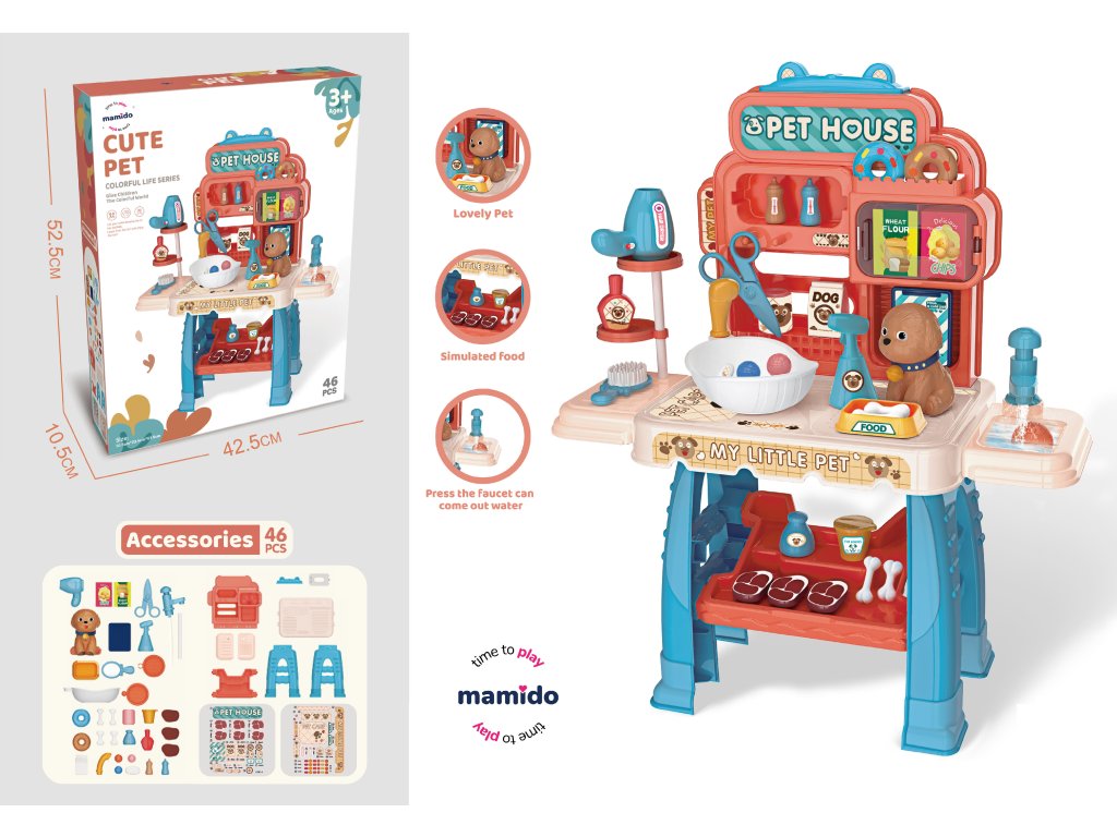 Uroczy zestaw do zabawy dla małych miłośników zwierząt, który pozwoli dzieciom opiekować się własnym pieskiem. Kolorowy stolik z akcesoriami oferuje wiele możliwości zabawy – dzieci mogą przygotować jedzenie dla pieska, wykąpać go, wysuszyć suszarką lub uczesać szczotką. Nie brakuje również akcesoriów, takich jak nożyczki, butelki, miski czy imitacje psich przysmaków.