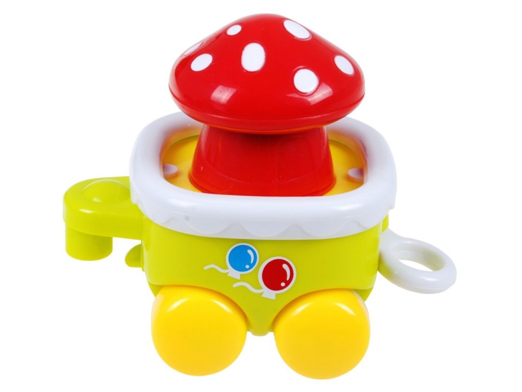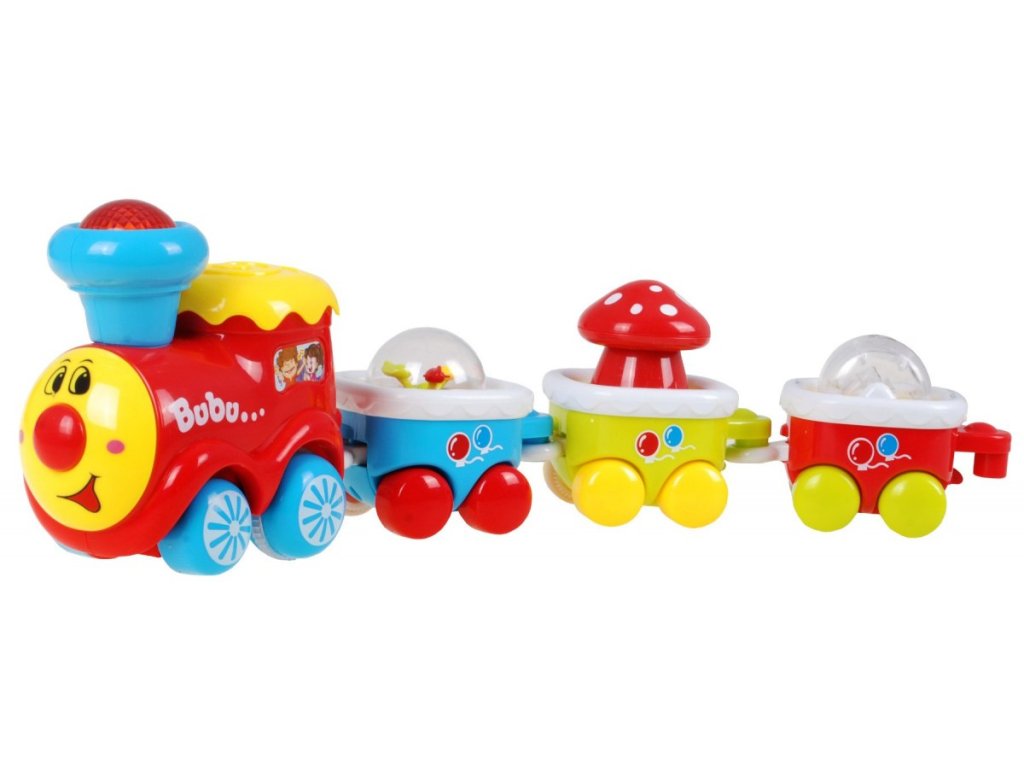 Interaktywny pociąg z dźwiękami sprawi radość każdemu dziecku, które kocha pociągi. Wesoły pociąg w ruchu pozytywnie Cię zaskoczy. Wyruszysz w kolorową podróż w towarzystwie przyjemnych melodii. Każdy z trzech wagoników pełni inną funkcję – znajdziemy tu obracającą się muchomorkę, poruszające się kolorowe kwiaty i grzechotkę z kolorowymi kuleczkami. Dodatkowo, zabawę urozmaica kolorowo migający komin, melodie i dźwięk pracującej lokomotywy. Lokomotywę można łatwo połączyć z wagonikami.