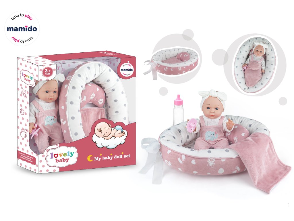 Urocza lalka-bobas z gniazdkiem jest stworzona dla wszystkich małych mam. Bobas jest ubrany w różowy strój z opaską, a w zestawie znajduje się również gniazdko do spania, butelka, smoczek i kocyk.