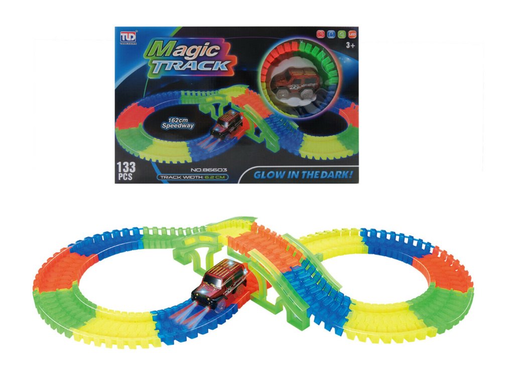 Magiczna Trasa z 133 Elementami: Przeżyj przygodę z naszą fascynującą trasą! Zestaw zawiera aż 133 elementy i kompleksowy zestaw torów, w tym mosty. Bądź kreatywny i zbuduj trasę według swojej wyobraźni - w kształcie ósemki lub w dowolny inny sposób.