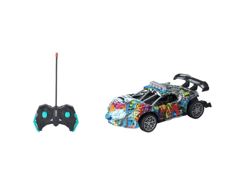 Stylowy samochód sportowy RC z graffiti designem zapewni dzieciom adrenalinową jazdę pełną zabawy. Dzięki sterowaniu samochód radzi sobie z jazdą do przodu, do tyłu, w lewo i w prawo. Model wyróżnia się atrakcyjnym wyglądem z dużym tylnym spojlerem i sportowymi detalami, które przypominają prawdziwy samochód wyścigowy.