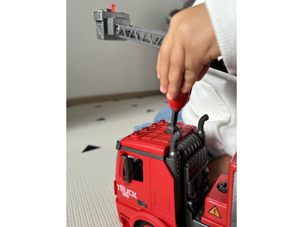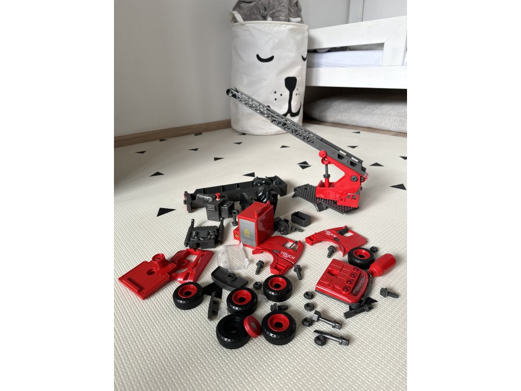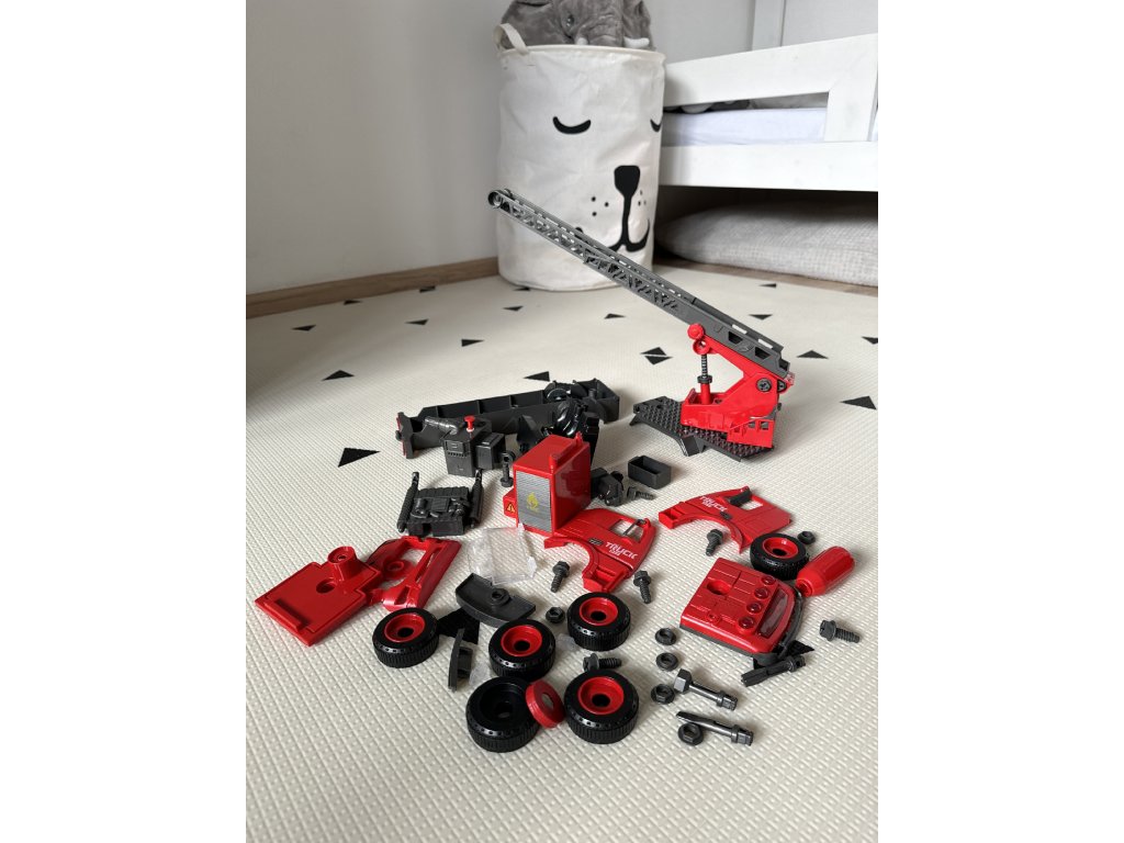 W zestawie znajdziesz: Wszystko, co potrzebne do złożenia strażackiego wozu, oraz zestaw śrubokrętów do montażu.