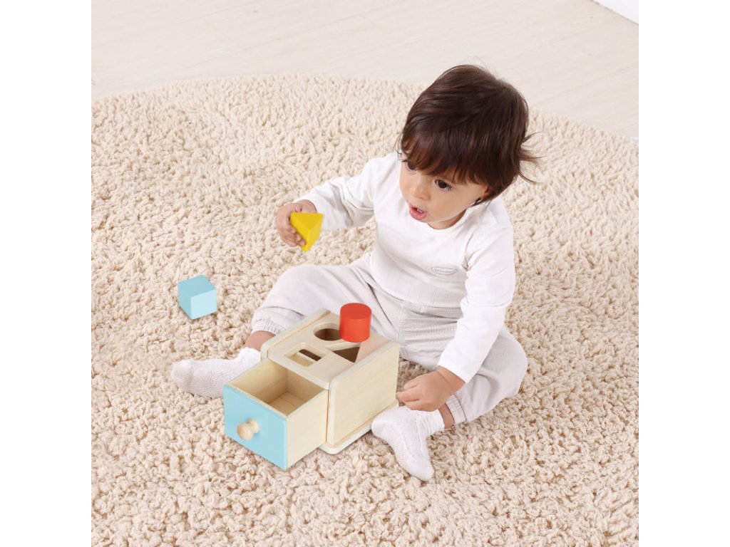 - Pozwala dzieciom wkładać przedmioty i odkrywać koncepcję trwałości obiektów.