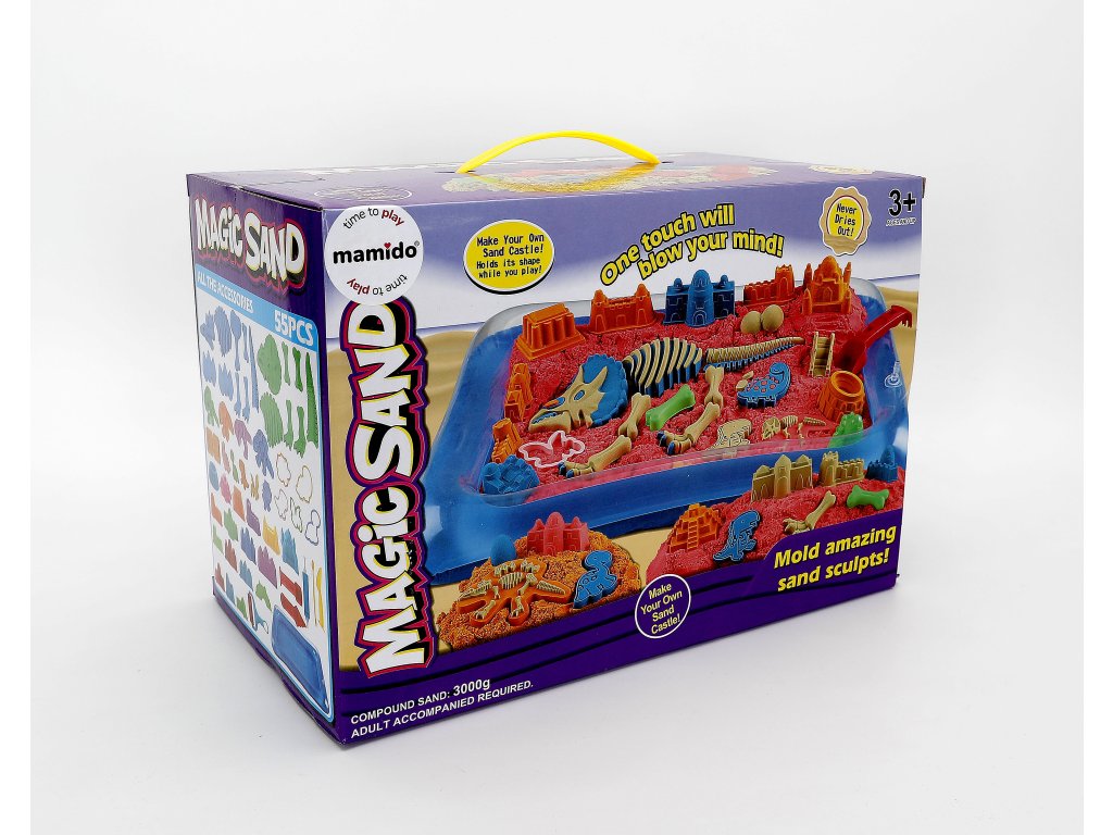Zestaw zawiera 55 akcesoriów – foremki dinozaurów, kości, wieże zamkowe, zwierzątka, łopatki i inne narzędzia. W zestawie znajduje się również nadmuchiwana mata, na której dzieci mogą bawić się bez bałaganu. Kolorowy piasek sprawia, że zabawa jest jeszcze przyjemniejsza i wspiera rozwój kreatywności, wyobraźni i małej motoryki.